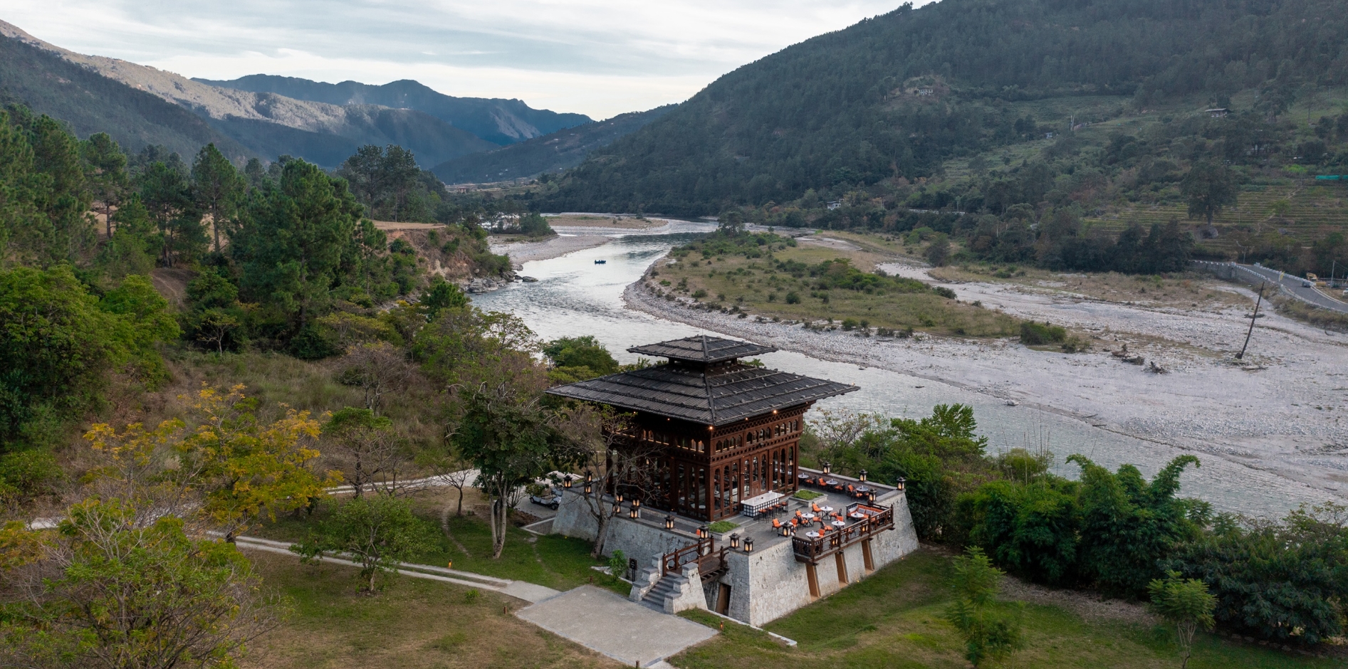 房舍設計延續不丹傳統建築語彙,搭配現代簡約線條與溫潤材質。大片落地窗將晨霧、河流與夕光引入室內,使時間在此變得緩慢而可感。清晨,可在鳥鳴與山嵐中醒來;午後,靜坐陽台,看雲影沿著河谷流動;夜晚,則在微光與靜默中回到自身。旅程行至此處,正好在戒楚節的喧鬧開始之前,形成一段必要的過渡。Pemako Punakha 不只是住宿,更是一段讓身心沉澱、重新整理感受的空白時刻,讓不丹的精神層次,從節慶與寺院,延伸至生活本身。