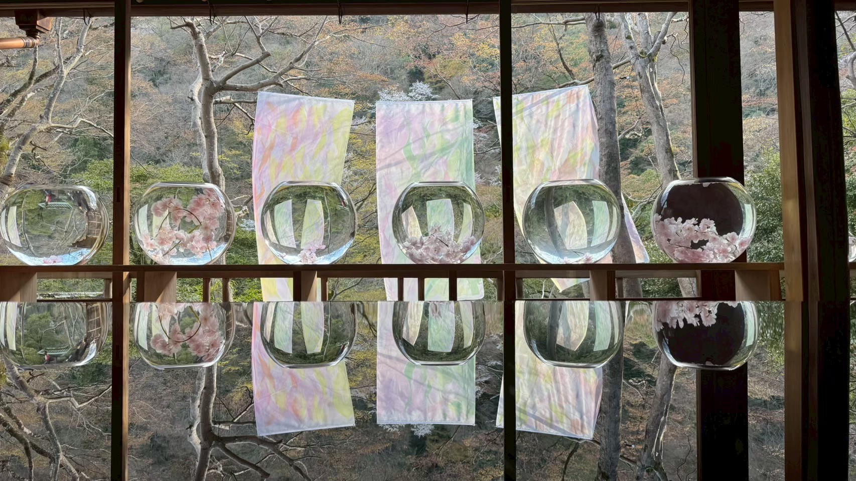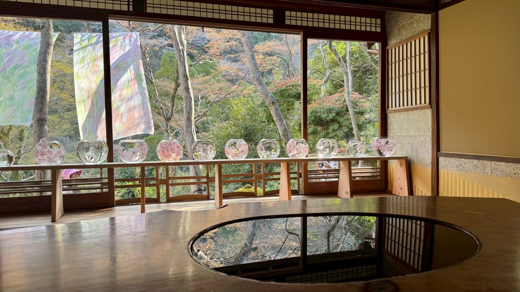 是一座擁有150年歷史的建築,以桌上倒映季節風景的圓窗房、反映嵐山季節變化的水鏡、可欣賞四季之美的川端康成的房間而聞名,還可欣賞奧田祐齋的夢幻染色藝術,是一個充滿歷史、文化、自然、染色藝術的獨一無二的空間。