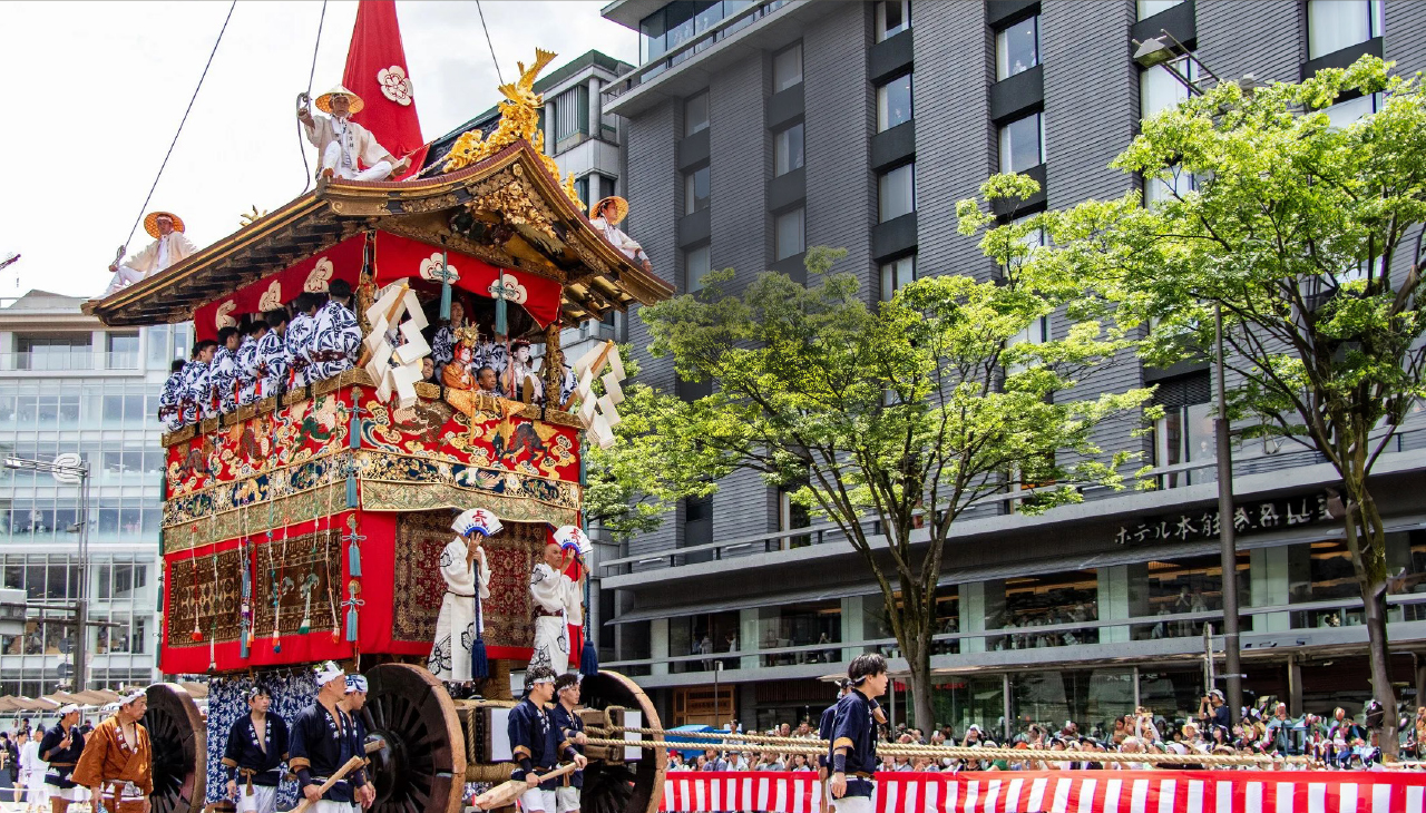 祇園祭的重頭戲莫過於山鉾巡行。前祭7月17日的山鉾巡行,以長刀鉾為首的23輛山鉾從四條烏丸出發,在祇園囃子的伴奏下緩緩行進。後祭7月24日的山鉾巡行,以橋弁慶山為首共11輛山鉾組成,從烏丸御池出發,至四條烏丸。鉾車高度可高達25公尺,且重達12噸,需要40至50人拉動。山鉾只能筆直前進,在轉角處為了改變方向,會表演精彩豪爽的「辻迴」轉彎,巨大的山鉾以人力轉彎成為巡行的亮點。將竹板鋪放在山鉾前並灑水,隨著吆喝吟唱聲旋轉的景象,充滿熱情,震撼人心。