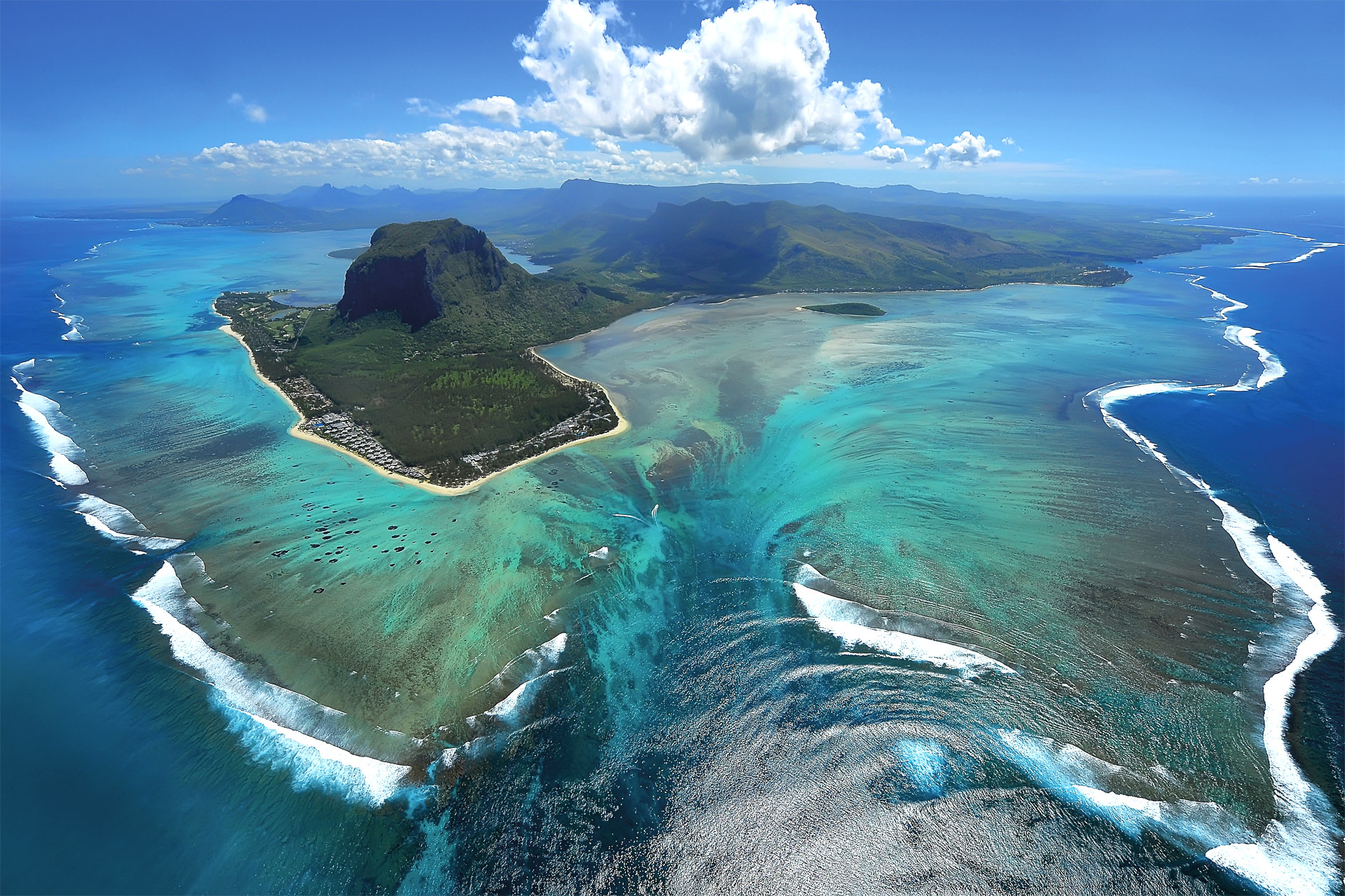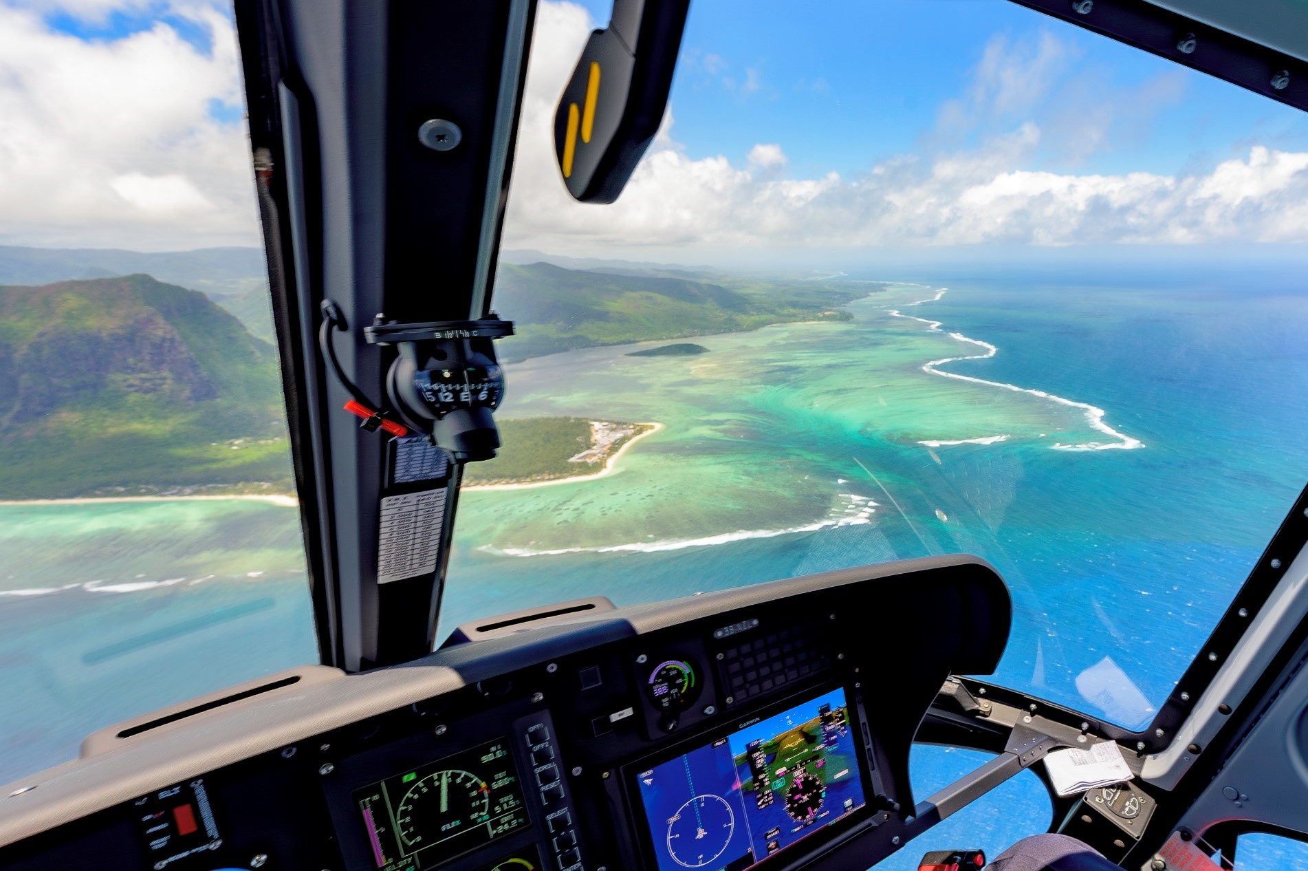 搭乘直升機,從空中俯瞰模里西斯壯麗島嶼景觀。沿途瀑布、七色土、潟湖與大灣盡收眼底,專屬導覽解說,尊享空中奢華視角,全程約1小時,號稱世界奇觀的海底瀑布必須用直升機從某特定角度跟陽光折射下才看得到。是搭乘直升機的必看行程。